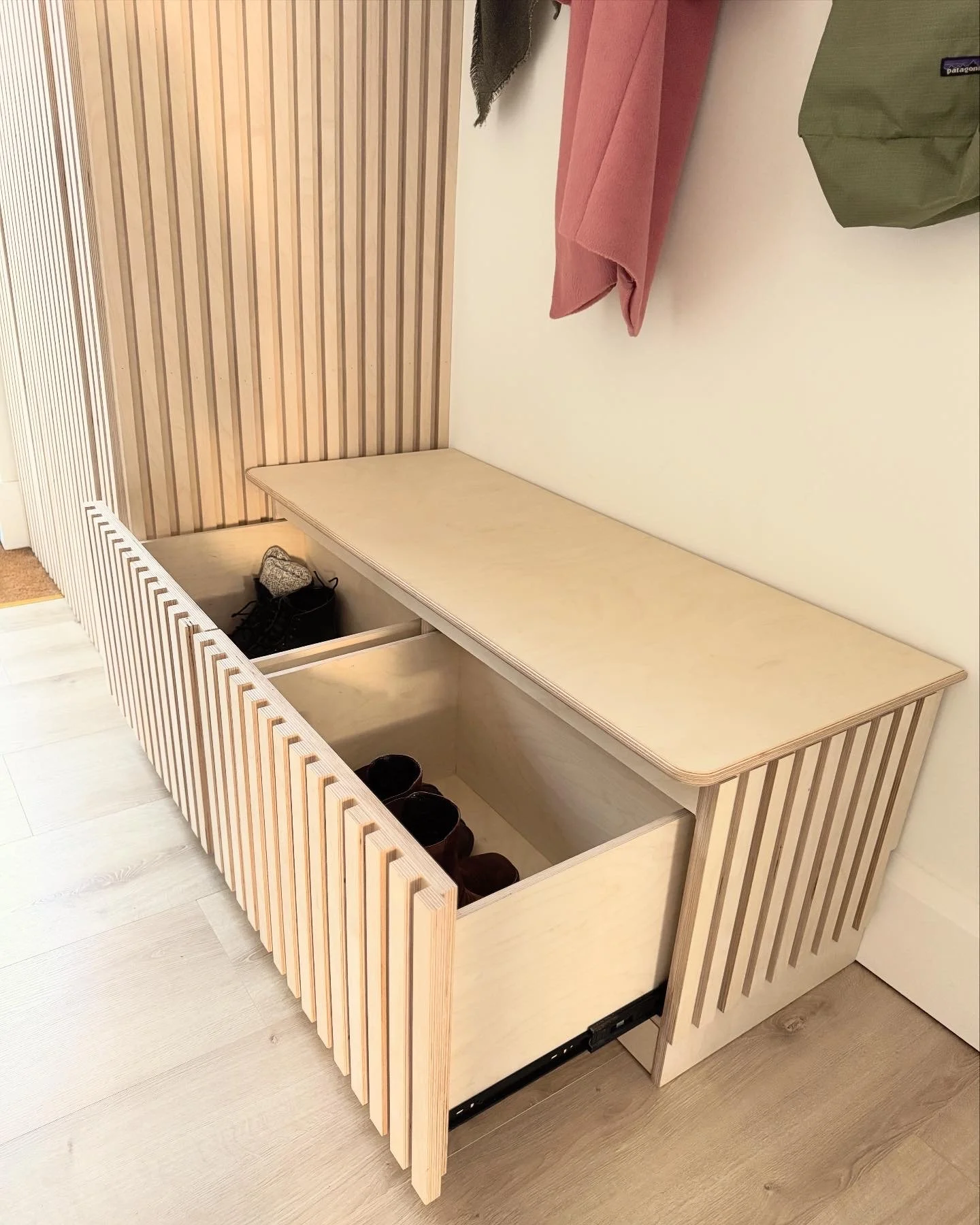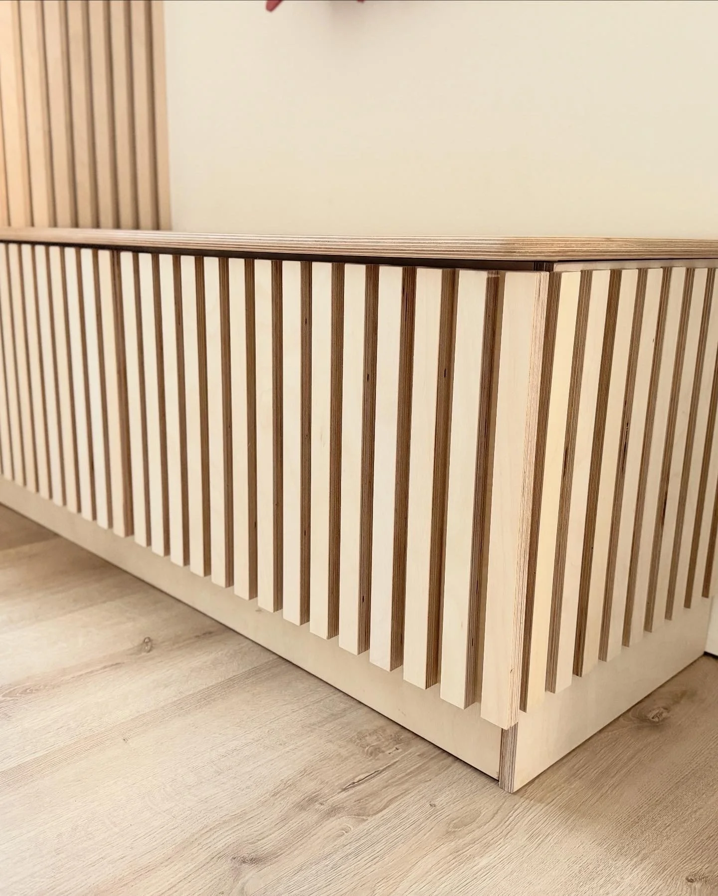 We decided to build a bespoke unit that tied in with the existing cupboard design and wrap the drawer fronts and side panel with matching plywood slats ensuring the spacing and sizes were all kept uniform so the bench seamlessly fitted into the space.