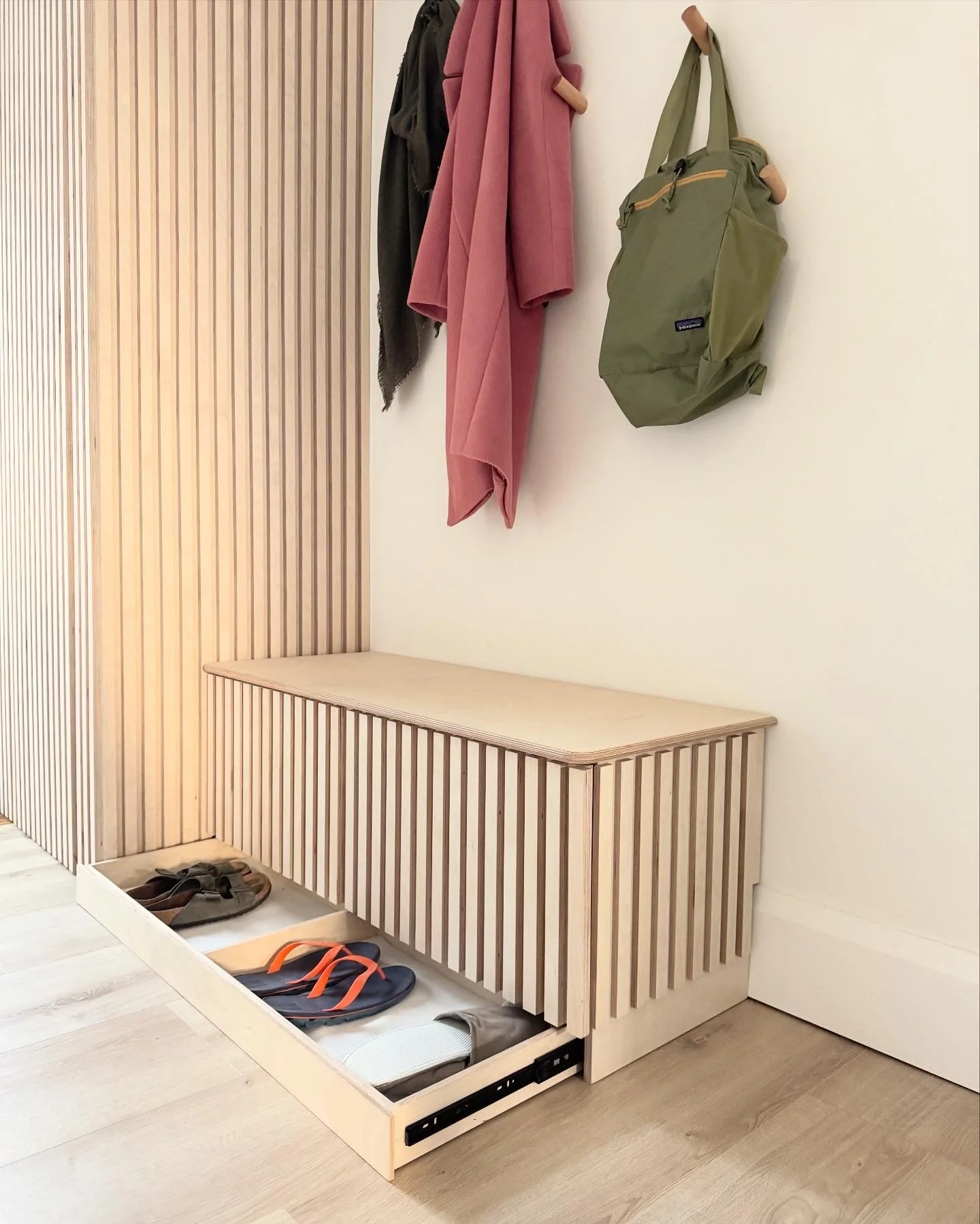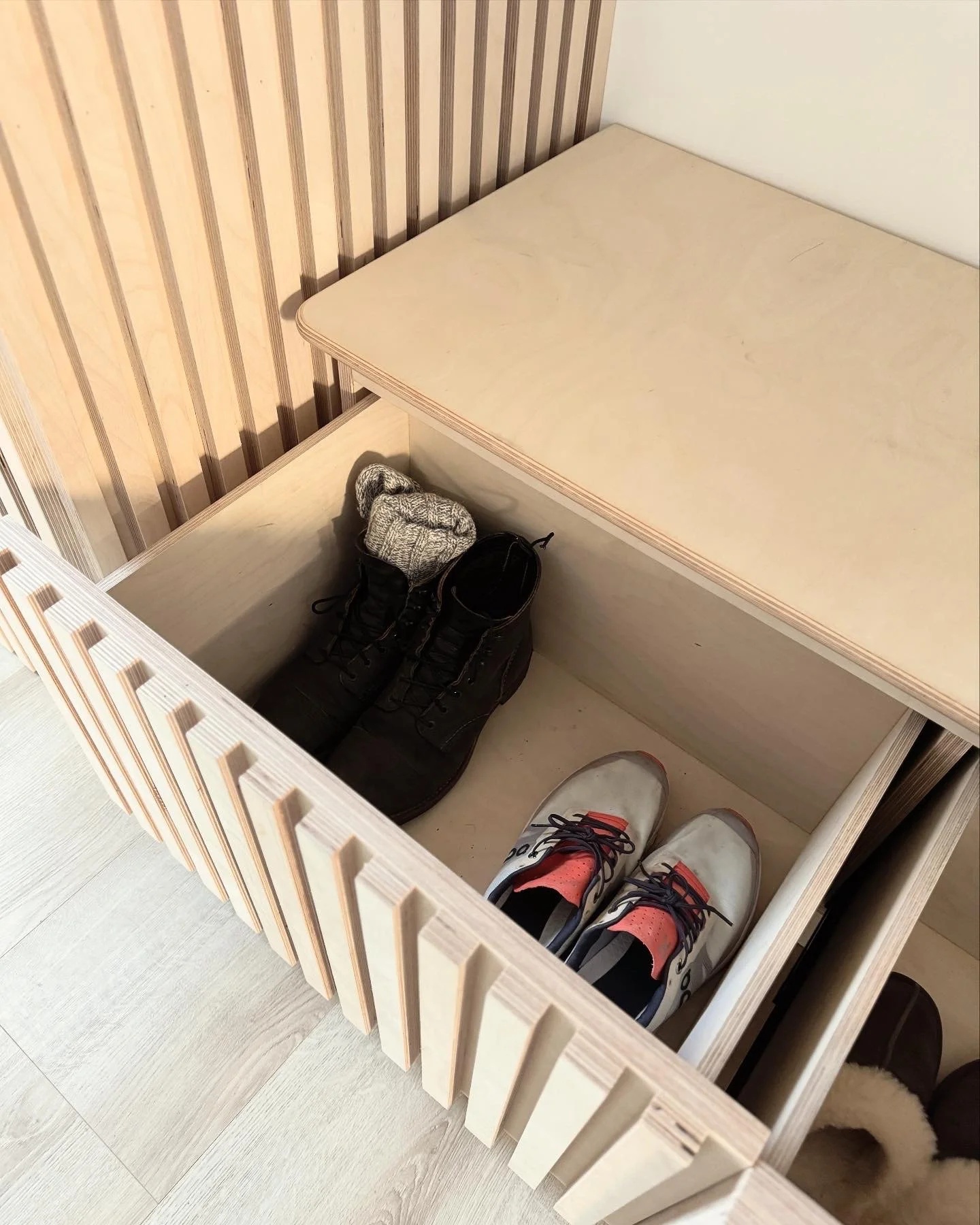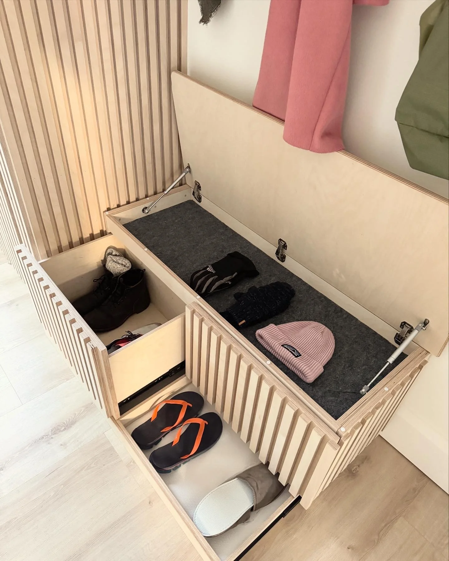The front of the bench features two push-open deep drawers to house up to 4/5 pairs of shoes and boots, below this there is a ‘secret’ toe-kick lower drawer that releases and is used for storing slippers and their Birkenstocks. This toe level push-open drawer is a super handy use of space in an otherwise empty void.